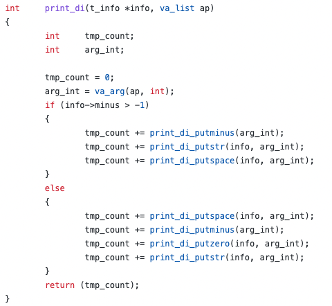 di는 폭과 정밀도, - 0 공백 +를 구현해야 한다. 더 많은 플래그를 구현해야 하지만 본 함수의 코드는 -를 기준으로 분기한 % 와 크게 다르지 않다.