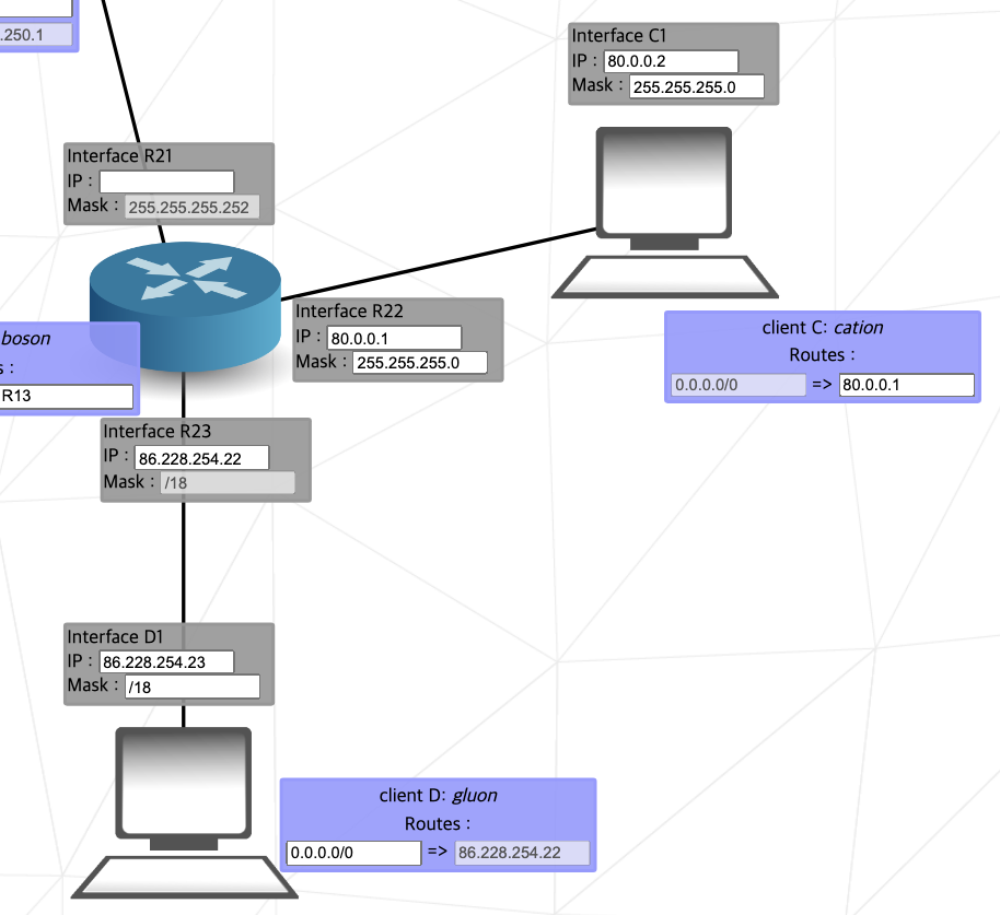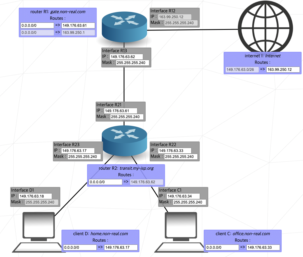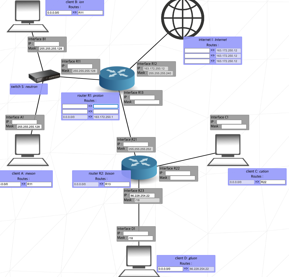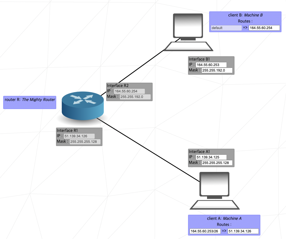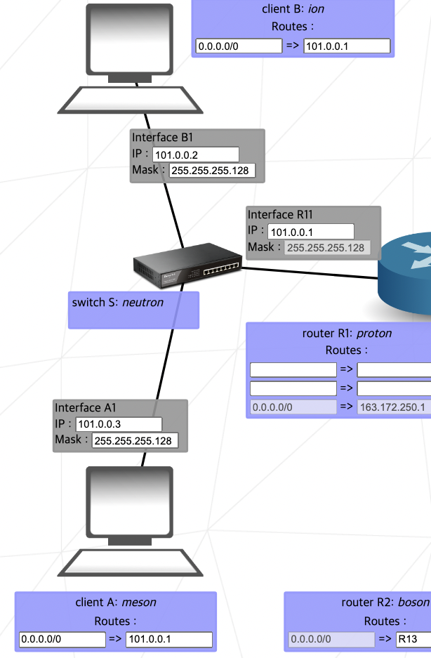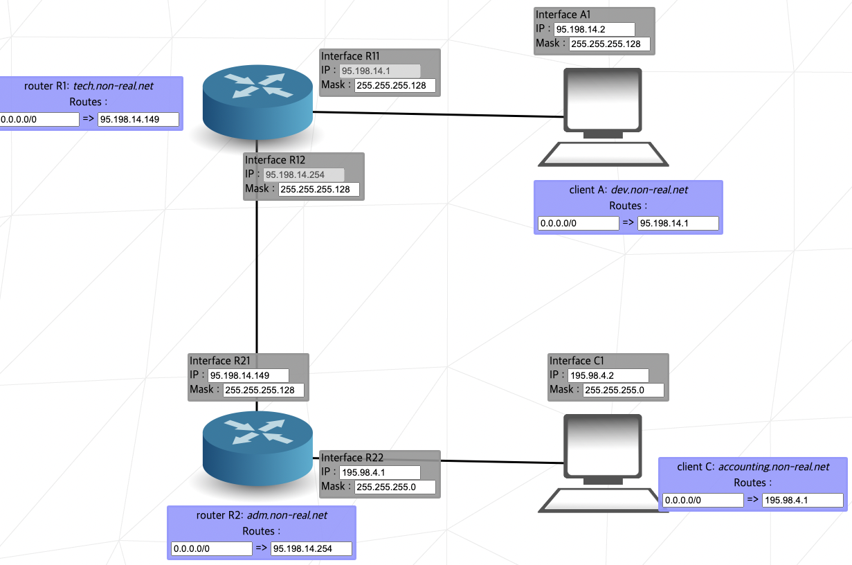 R1과 R2와 R3는 다르면서, R1과 A1과 B1이 동일하게 설정해야 하는데 A1 컴퓨터(클라이언트 A)의 IP가 잠겨있으므로 그걸 기준으로 생각해서 변경하면 된다.