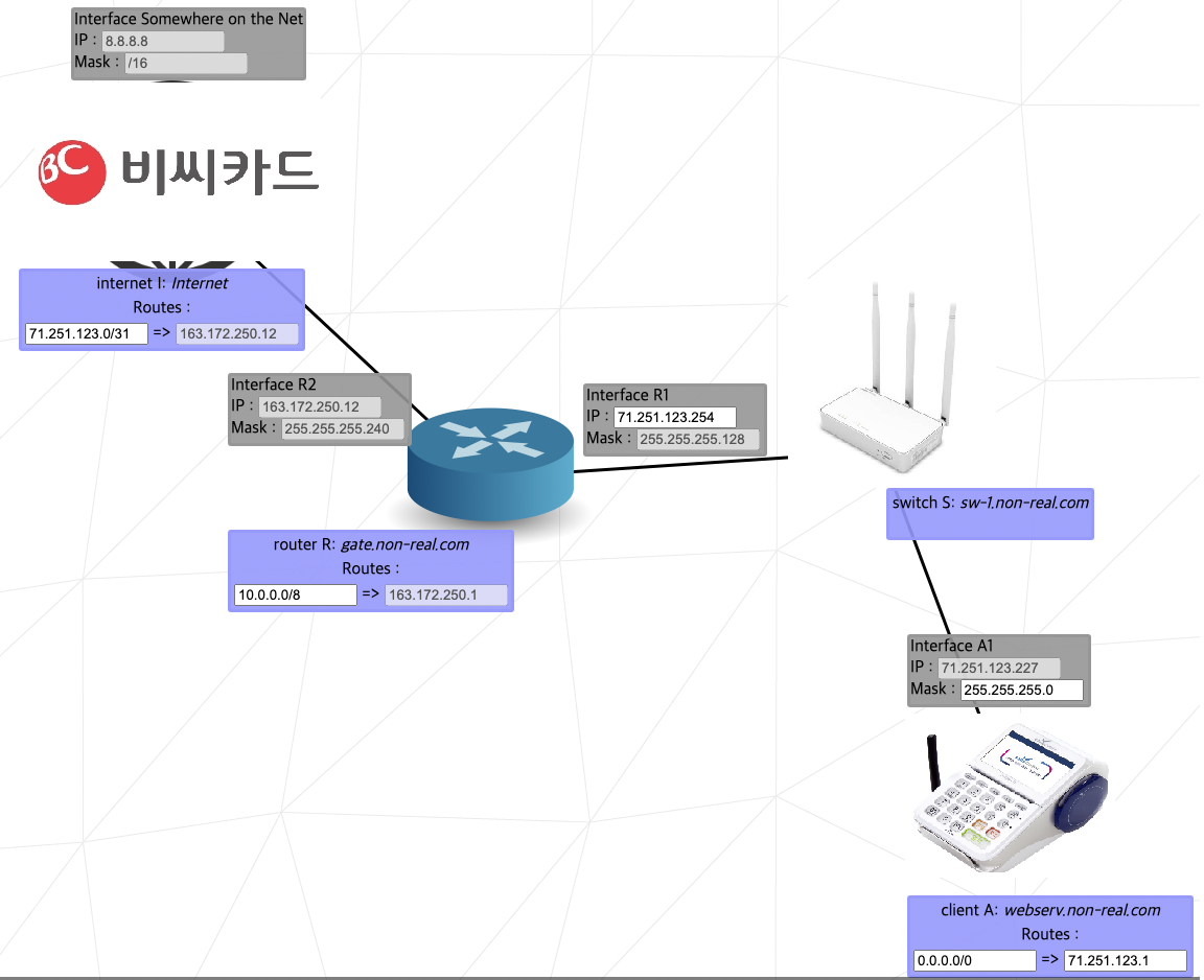 카드 단말기 바로 위에는 스위치가 있는데 쉽게 설명하면 집에 있는 인터넷 공유기를 생각하면 된다. '스위치는 MAC address를 기준으로 데이터를 나누고, 공유기는 ip를 기준으로 나누면서 DHCP 프로토콜을 통해 하위 장비에 ip를 부여하고 NAT 기능을 통해 사설 ip를 공인 ip로 변경하여...' 어쩌고 하는 설명은 쉽게 설명할 자신이 없어서 넘길 테니, 그냥 저게 공유기인데 내가 직접 ip를 할당해야 하는 귀찮은 공유기라고 생각하고 추가로 궁금한 부분은 '공유기와 스위치'라고 검색해보자