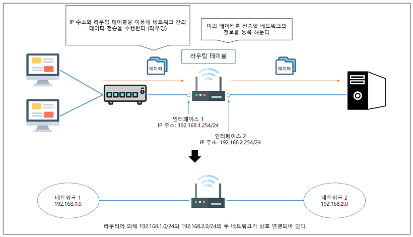 그래서 한 라우터 안의 다른 네트워크끼리는 무조건 다른 네트워크 주소를 사용해야 한다. 예를 들면 '경부선을 타고 내려가라'라는 말을 들었는데 경부선이라는 이름을 가진 도로가 여럿이면 어디로 가야 하는지를 알 수 없듯이 한 라우터 안에서 같은 네트워크 주소를 지닌 경로가 여럿이면 패킷이 갈 길을 잃어버리게 된다.