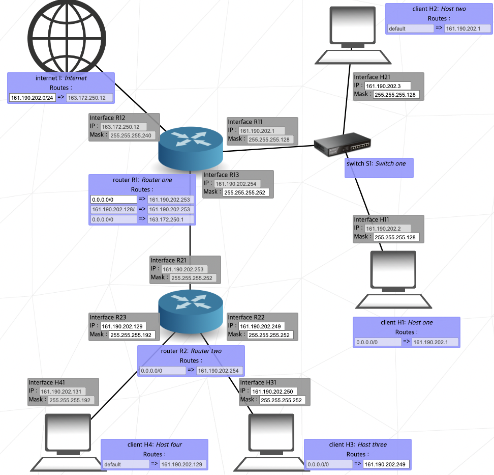 다만 R22-H31을 연결할 때 왜인지 안된다면 같은 ip/넷마스크를 다른 데서 사용하지는 않는지 확인하면 좋다. 127보다 낮은 숫자를 끝자리에 입력하면 스위치 S1의 로컬 네트워크와 동일해서 인터넷에서 들어오는 패킷이 R1에서 헤매게 돼서 안된다.
