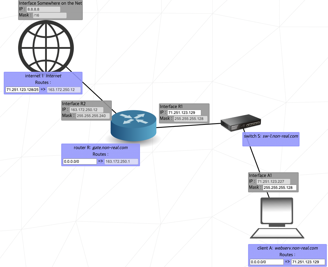 인터넷에서 값을 입력할 때에는 반드시 목적지를 적어줘야 한다. 라우터에 들어갔을 때 어디로 돌아가야 하는지를 알려줘야 하기 때문에 defalut나 0.0.0.0/0을 사용할 수 없다. 네트워크 주소만 동일하면 되기 때문에 여러 가지 정답이 있는데 71.251.123.227/32 나 71.251.123.128/25로 설정하면 된다. 71.251.123.0/24 도 되긴 하지만 다른 라우터가 없기 때문에 가능한 것으로 정상적인 경우는 아니다.