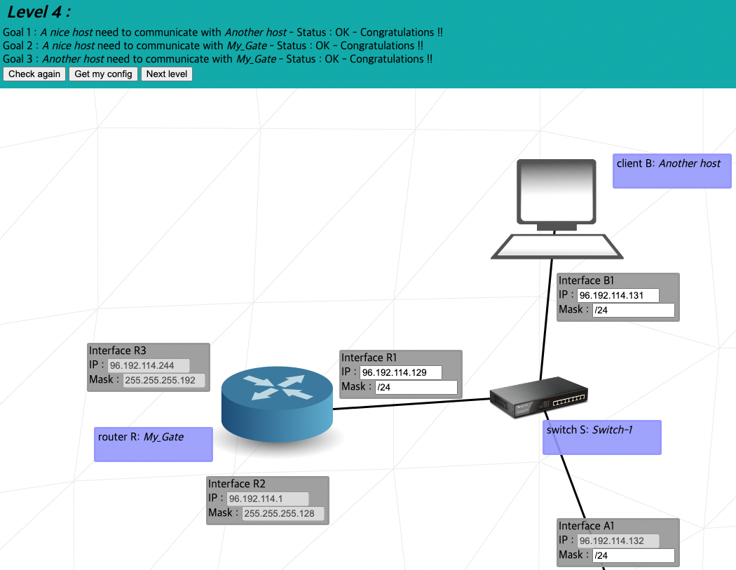 다만 /24를 기준으로 볼 때 원래대로라면 96.192.114.1~96.192.114.254를 할당할 수 있겠지만 96.192.114.0~96.192.114.128과 96.192.114.192~96.192.114.255는 R2와 R3 라우터에서 사용 중이므로 사용할 수 없다.