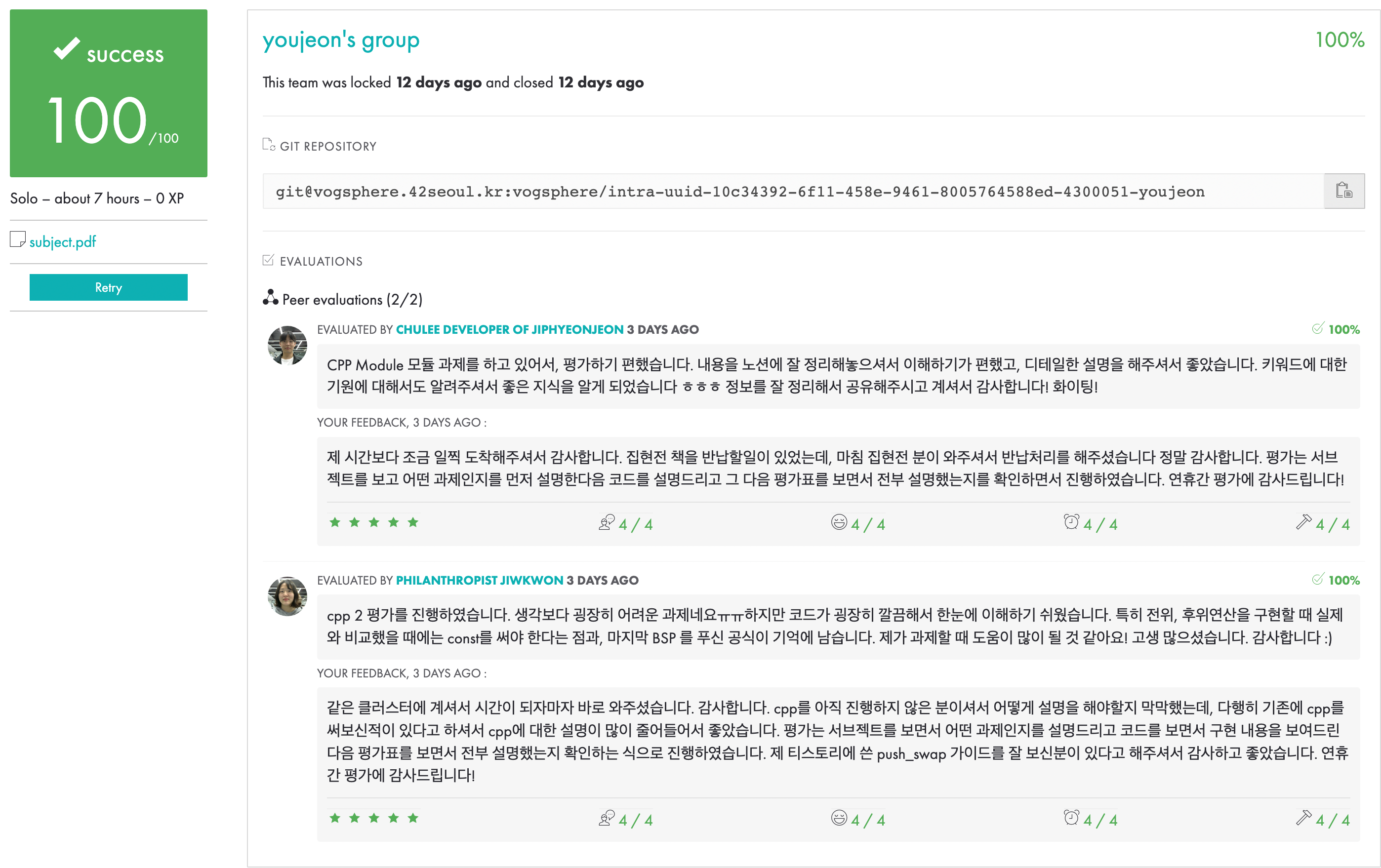 코드를 다 완성하고 나면 서브젝트와 코드 내용을 노션에 정리한 다음, 1~2일 후에 평가를 받고, 거기에서 3~4일 후에 글을 쓰니까 사실 난 의도적으로 복습을 하고 있는 게 아닐까?