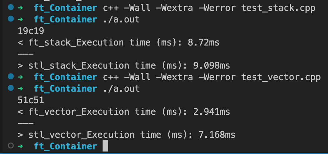 벡터를 만든 김에 스택에서 사용하는 컨테이너를 변경하고 테스트를 해봤다. 둘 다 멀쩡하게 돌아가는 걸 보면 크게 이상 없이 짠 것으로 보인다.