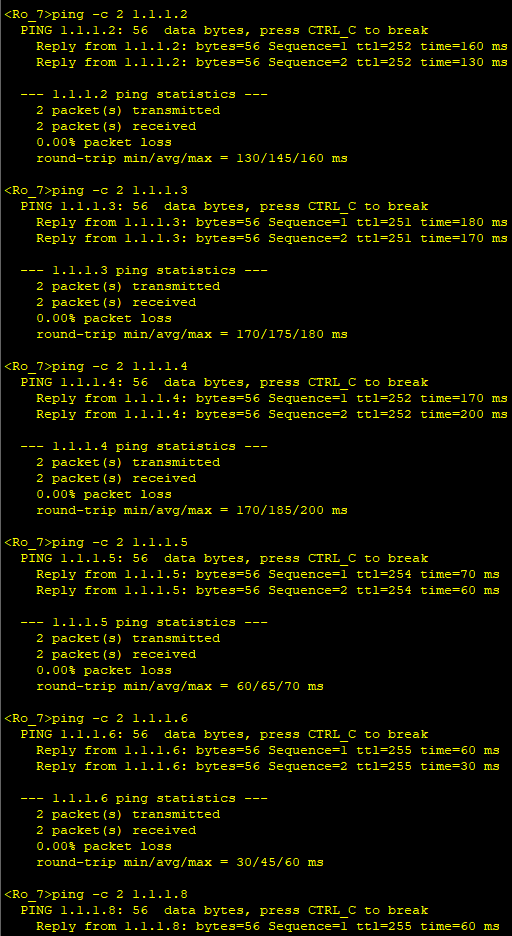 전체 장비의 핑을 확인했고, 1번과 7번이 통신이 잘 되는지를 스크린샷으로 남겼다.