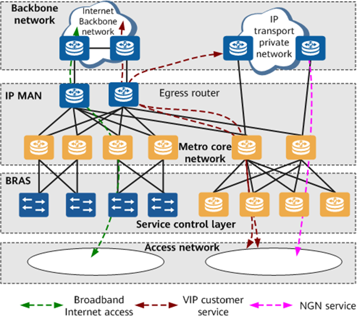 이 시나리오는 도시망(MAN: Metropolitan Area Network)의 코어부터 사용자 접속 계층까지 어떻게 활용될 수 있는지를 보여주는 시나리오다. 이 장비는 도시망의 코어 또는 제어 계층에 위치하여 대용량 데이터 트래픽을 안정적으로 처리하며, 다양한 서비스의 논리적 분리를 위해 MPLS VPN 기술을 기반으로 하는 고속 전송 구조를 지원한다.