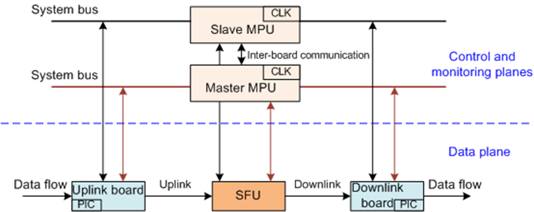 MPU (Master/Slave) ↔ SFU ↔ Uplink/Downlink Board 간의 신호 흐름 → 제어/데이터/모니터링 계층이 수직으로 배치되어 각 기능이 독립적으로 동작함